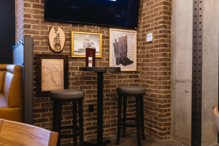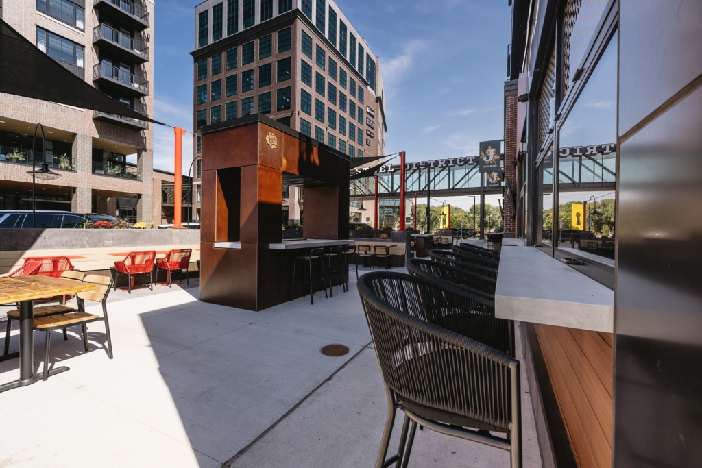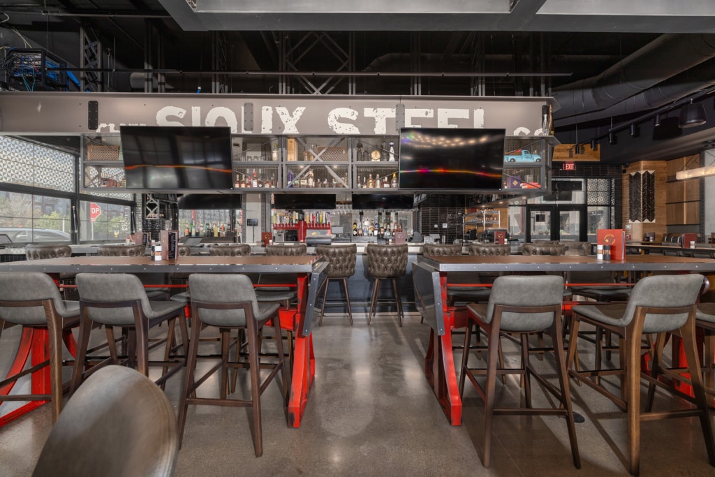 An array of visual brand expressions are woven throughout Jack Rose, creating a one-of-a-kind experience whether you’re grabbing happy hour on the patio or dining under a ceiling cloud of lights. The vibrant atmosphere feels South Dakota true with custom furniture, murals and decor bringing the space to life.
