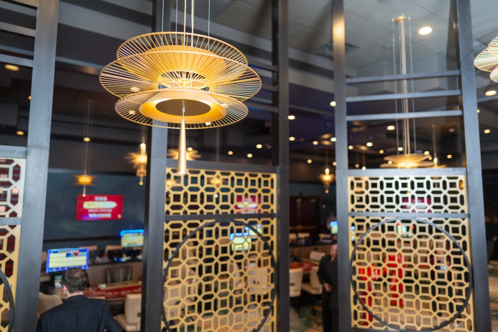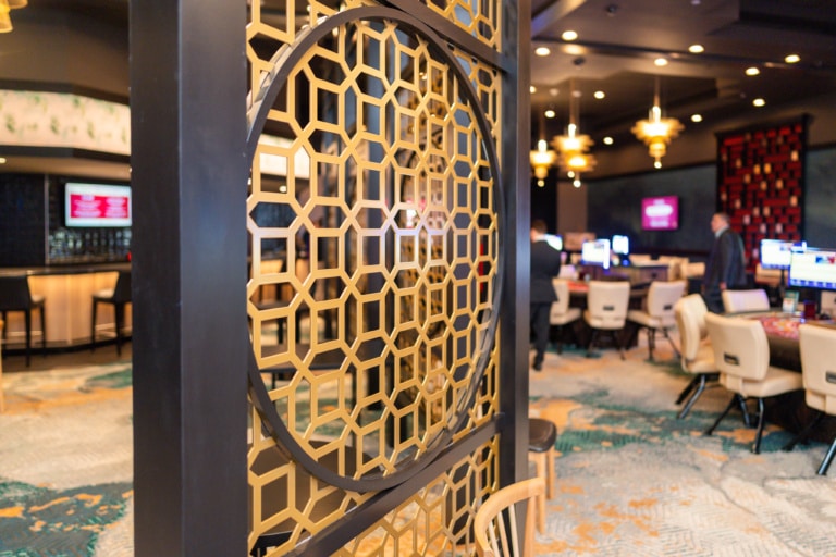 An all-new experience to Mystic Lake Casino Hotel, the baccarat room offers 12 tables of game play in an upscale setting with an onsite noodle bar and tea station. Following elements of Feng Shui, cool blue tones run throughout the room accented with reds, browns and greens to evoke water, fire and earth with wood and metal elements layered into the space. Relocated within the casino, the new Bingo Hall brings together bright patterns and color to create a high-energy atmosphere. Customizable lighting technology can transition from clean overhead lighting to rapid changing colored lighting for cosmic Bingo events, fully drawing guests into the Bingo experience.